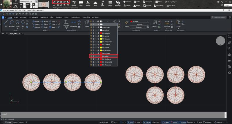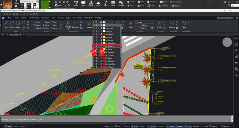 Portanto, não recomendamos apagar os layers com prefixo PA-, especialmente o PA-canteiro. Caso queira apenas não visualizá-los durante a elaboração ou evitar que apareçam na impressão, siga estas orientações: