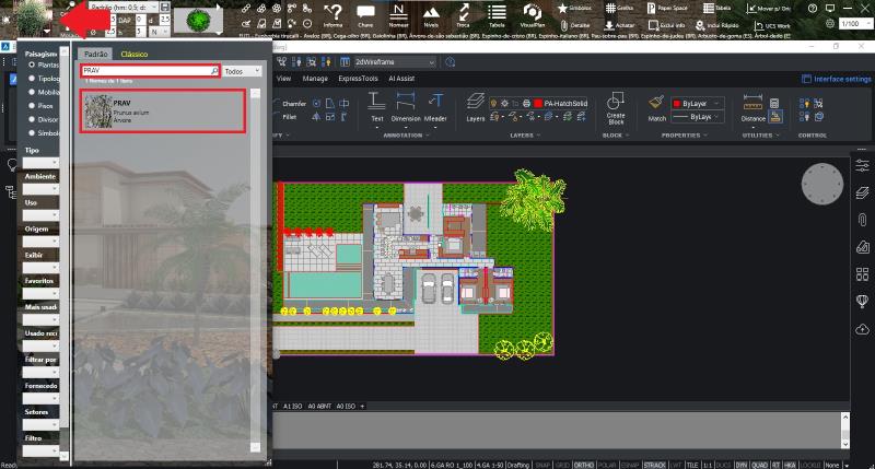 Abra o catálogo do AutoLANDSCAPE e selecione a categoria desejada e insira uma planta ou outro objeto no desenho.