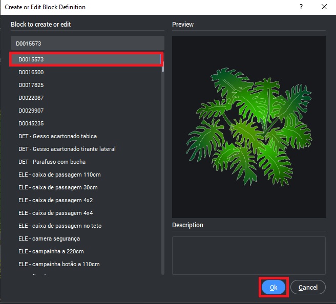 Edite o bloco da planta: para editar, dê dois cliques sobre a planta, após isso vai abrir a janela Create or Edit Block Definition, mostrando os blocos que estão no desenho. Selecione o bloco correspondente à planta que deseja alterar e clique em OK. O BricsCAD entrará no modo de edição do bloco.