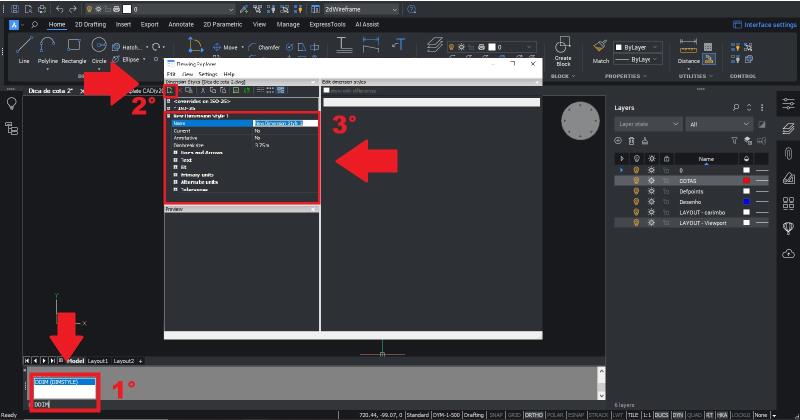 Antes de tudo, criaremos uma camada (Layer) para as cotas. Isso mantém o desenho organizado e facilita o controle da visibilidade e da impressão das medidas.