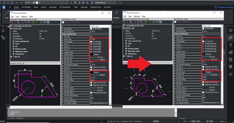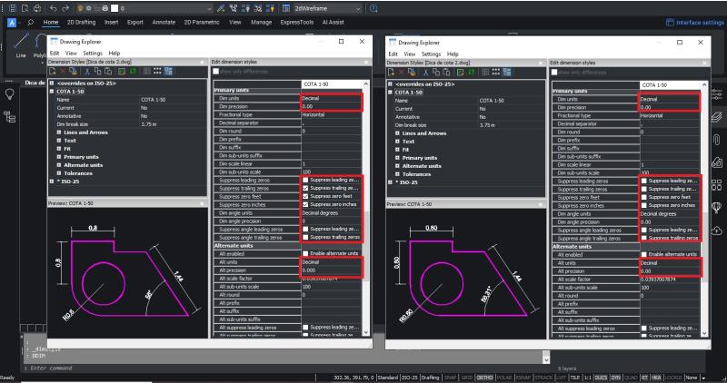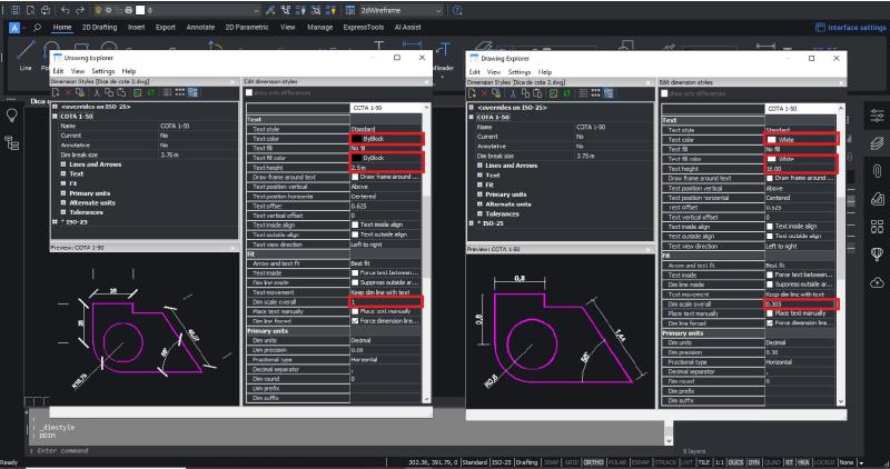 Para simplificar o processo, vamos definir valores padrão para todos os elementos da cota (texto, setas, linhas). A única configuração que muda entre escalas é o Dim scale overall, na aba Fit, que ajusta proporcionalmente todos os elementos para a impressão.