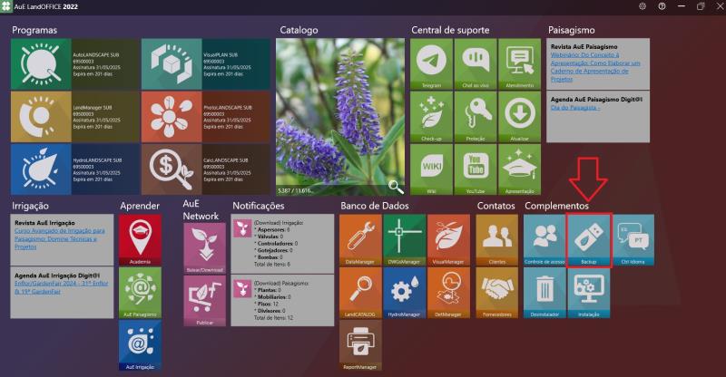 Com o AuE LandOFFICE aberto, vá até a seção de complementos e clique em Backup.