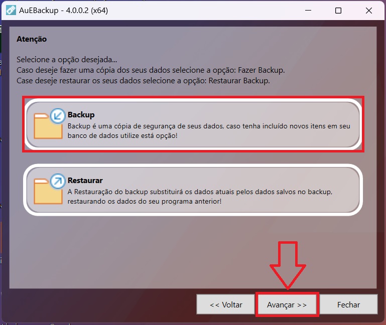 Uma nova janela será exibida. Nela, selecione a opção Backup e clique em Avançar.