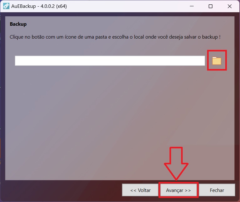 Agora, clique no ícone de pasta, escolha o local onde deseja salvar seus arquivos e, em seguida, clique em Avançar.
