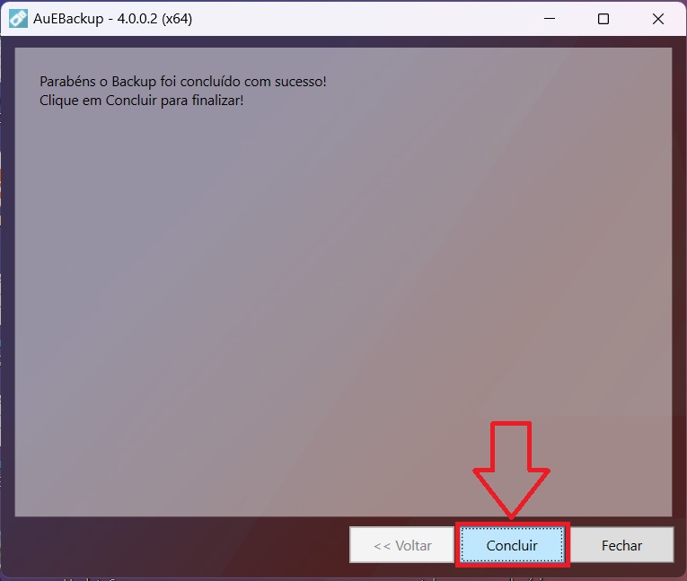 Quando o backup for concluído, uma mensagem de ok será exibida, clique em Avançar e uma nova janela será aberta. Nela, basta clicar em Concluir. Pronto! Uma cópia dos seus arquivos já estará salva em sua máquina.
