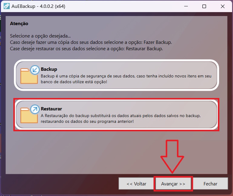 Agora, vamos aprender a restaurar o backup. Para isso, acesse o mesmo local onde você fez o backup, mas desta vez selecione a opção Restaurar. Em seguida, clique em Avançar.