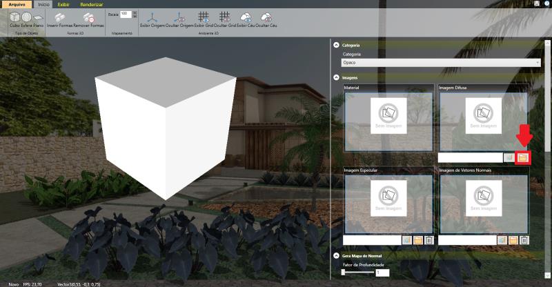 Ao abrir o Material Edit, localize na lateral direita a aba Imagens. Dentro dela, na área de Imagem Difusa, clique na pasta amarela para selecionar a textura que será aplicada ao material.