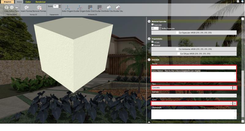 Em seguida, selecione o tipo do material, no nosso caso, um divisor de concreto, e insira também o nome do autor.