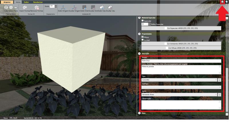 Após preencher as informações, salve a textura. Na parte superior direita do Material Edit, clique no ícone de disquete para concluir o processo.