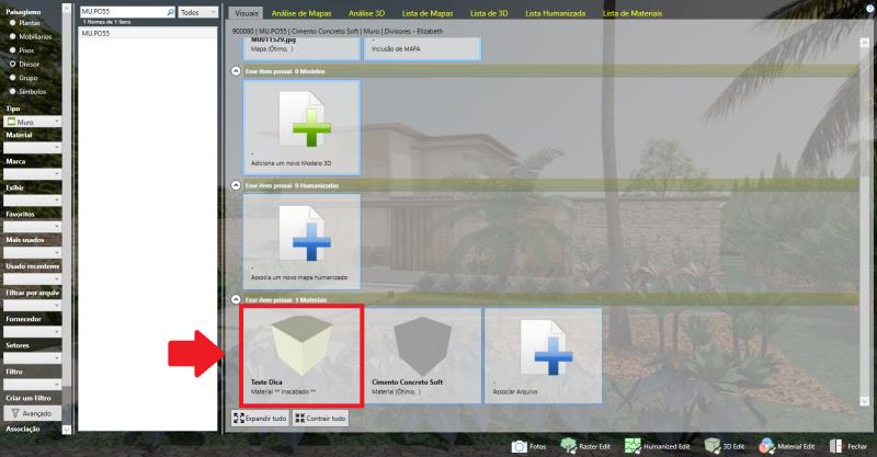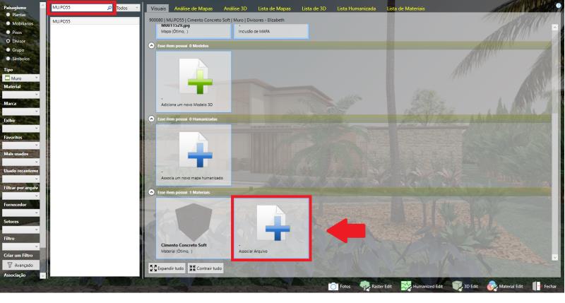 Após selecionar o divisor, MU.PO55, localize a textura criada e, na parte inferior, clique no ícone Associar Arquivo para vinculá-la ao divisor.